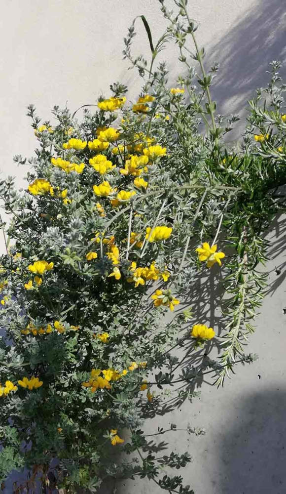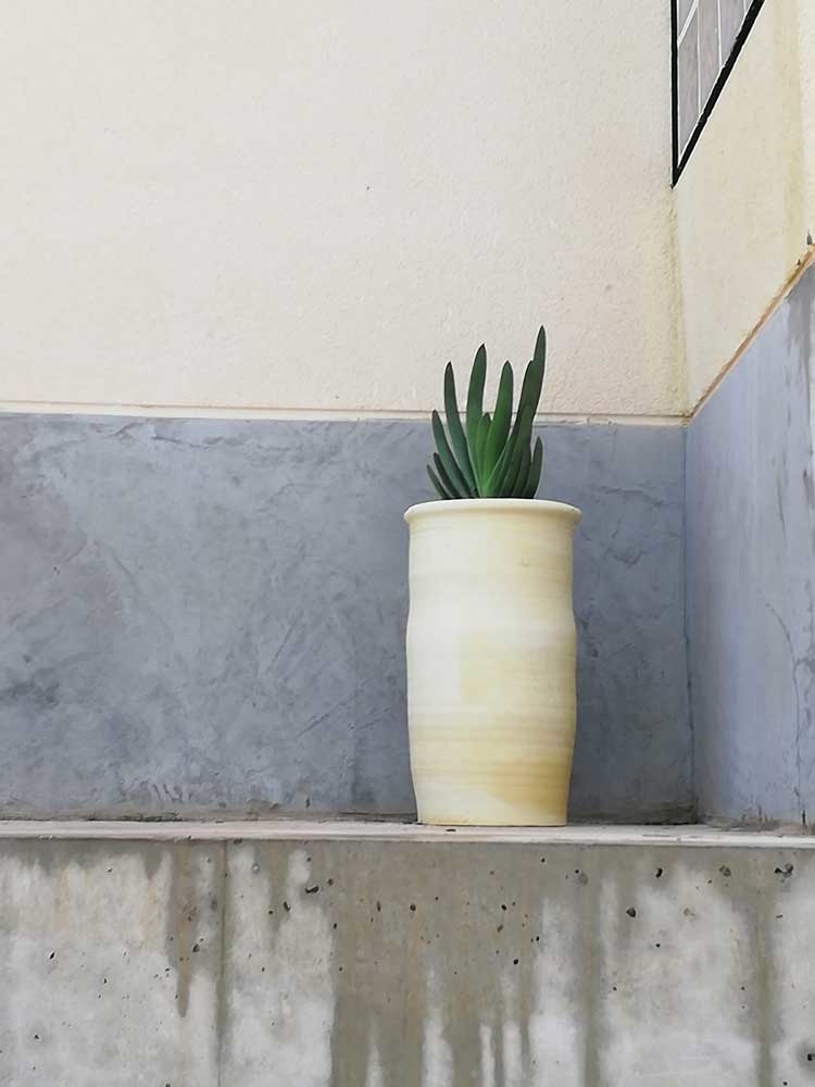 El mayor reto para este jardín en pendientes aterrazadas es su orientación. La parcela está en primera línea litoral, orientada al Este y recibe viento de levante que en el Mediterráneo es fuerte y salino. Descartamos coníferas autóctonas como Tetraclinis articulata por problemas de alergia y optamos por arbustos para ocultar vistas como Pittosporum tobira, Metrosideros excelsa. Arbolado como Phoenix dactylifera, Chamaerops humilisy Tamarixgallica y Tamarix ramosissima. Intentamos crear cierto recorrido visual en las composiciones con floraciones estacionales, queríamos además que las plantas tuvieran en ocasiones porte elevado y en otras crecimiento tapizante, o que incluso, se descolgaran por los muros cubriendo el hormigón. Las especies han funcionado correctamente, destacando Lotus creticus, Ampelodesmos mautitanica , Eragrostis trichodes , Helichrysum italicum , Rosmarinus officinalis ‘Boule’ , Crithmum maritimum , Dorycnium petaphyllum , Limonium perezzi , Capparis spinosa ruspestris. La ejecución de las pendientes se hizo con tongadas longitudinales compactadas y dejándolas secar. Se utilizó tierra vegetal de base con piedras y cascotes para rematar con una tierra mejorada con arena y compost en las plantaciones. La sujeción de las pendientes se contuvieron con mantas orgánicas de yute que escondía un sistema de riego puntual.